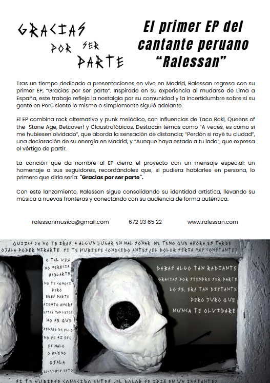 I led the music management, content production, and strategy for the release of the EP “Gracias por ser parte” by rock/punk artist Ralessan alongside Patricia Alvarado for a year.